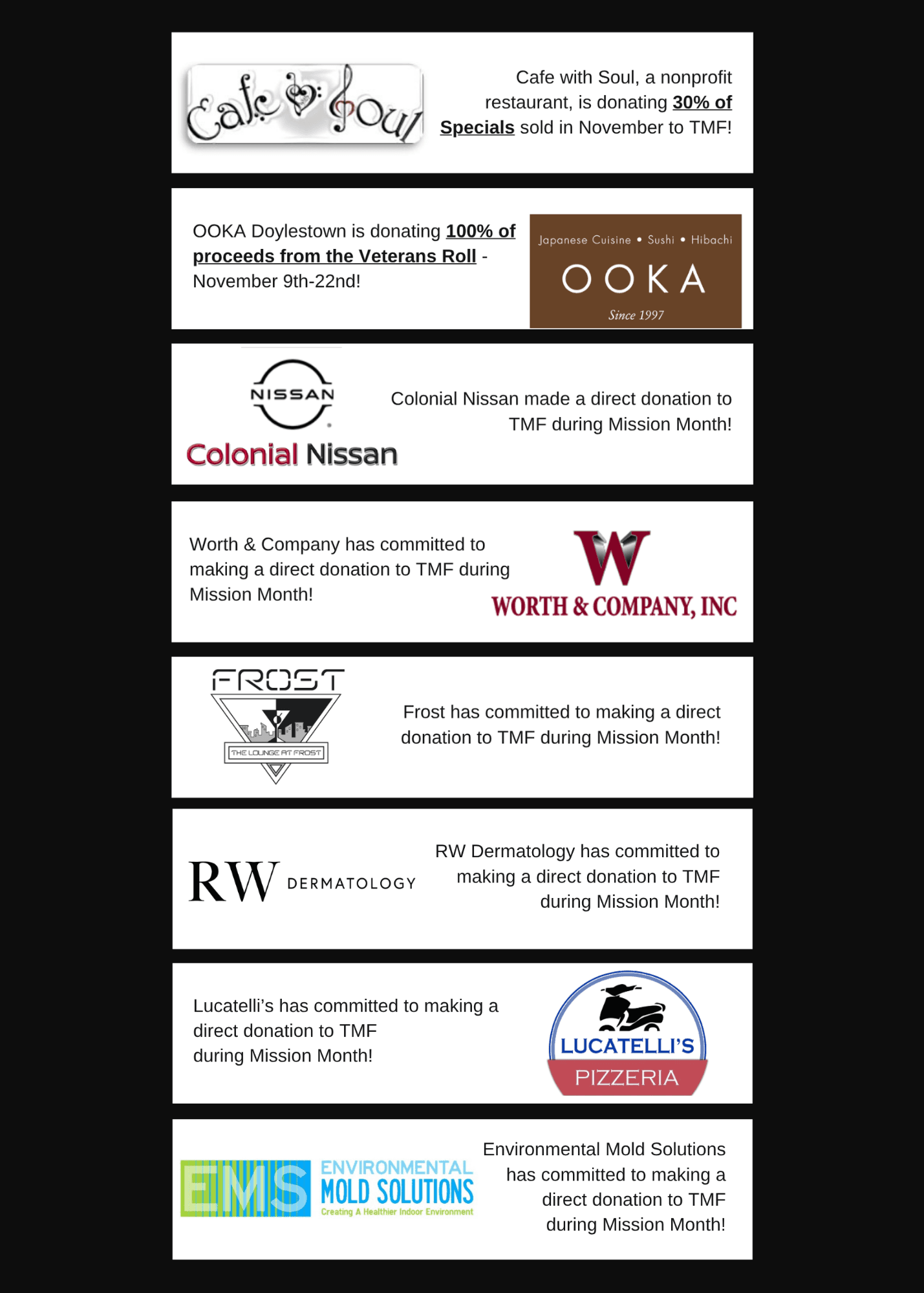 Join us for MISSION MONTH 2025, a community-wide fundraising initiative where local businesses are teaming up to support Travis Manion Foundation throughout the month of November.
